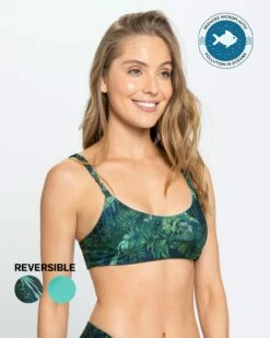 Craquez pour ce haut de maillot de bain réversible aux bonnets amovibles en mousse douce push-up. Le détail des bretelles froncées est spectaculaire et ajoute une touche très mode et cool au vêtement. Si vous êtes adepte de la mode durable, vous serez heureuse d’apprendre qu’il est fabriqué à partir de 0,8 bouteilles en PET recyclées et qu’un additif spécial CICLO est incorporé dans le tissu. C’est un composant qui accélère la décomposition et permet à plus de 90% du polyester de se dégrader en 6 ans, dans un espace humide, sans lumière et avec des bactéries, comme l’océan, le compost ou la décharge. (La décomposition normale du polyester peut prendre des centaines d’années.).