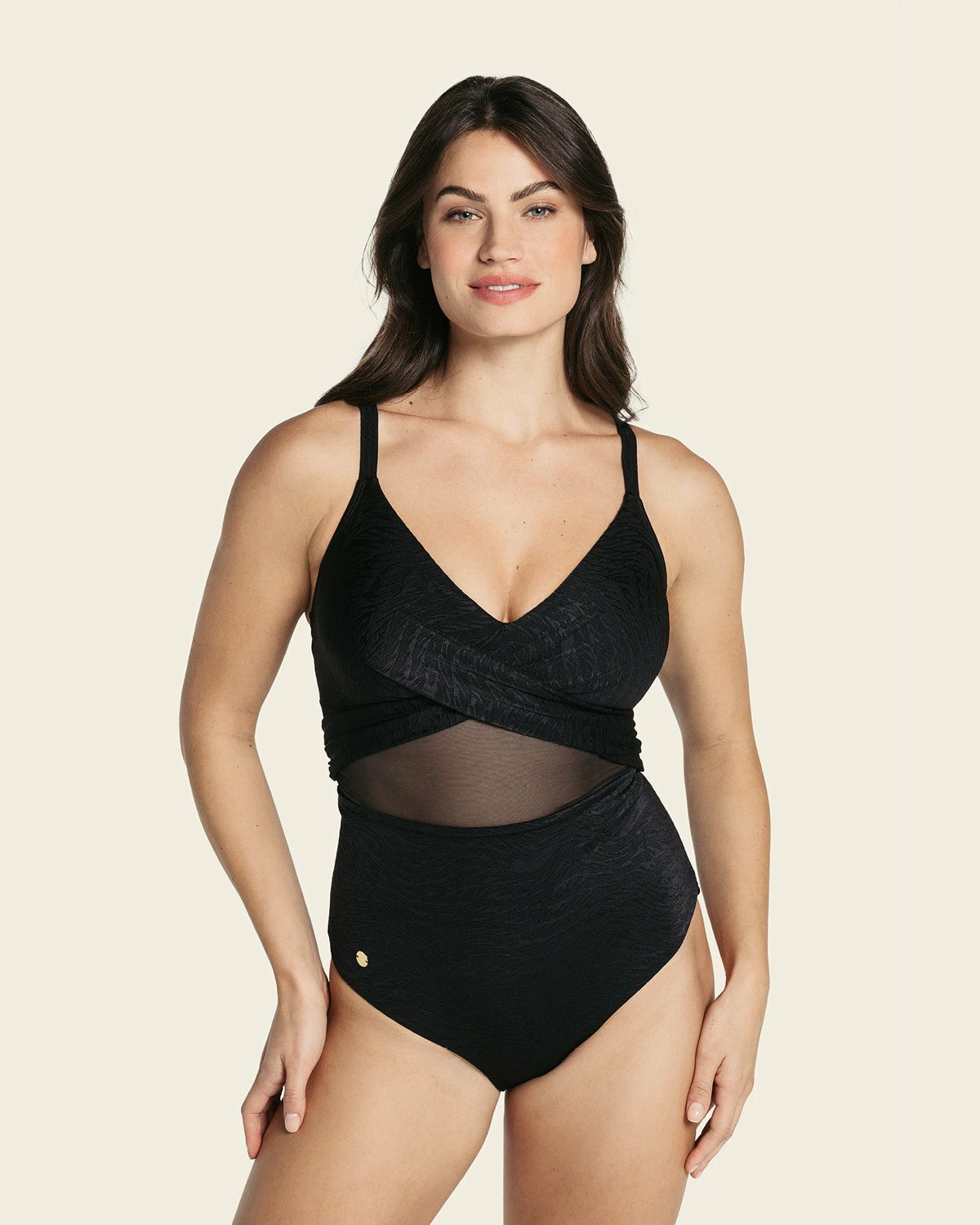 Vous allez avoir l’air et vous sentir spectaculaire dans ce maillot de bain une pièce léger. Ses bonnets fixes en mousse arrondissent votre poitrine, et ils sont sans fils ! Une bande élastique sous la poitrine offre un super soutien. Dispose d’une couche de tulle transparent sur le haut du ventre et de détails drapés sur les bonnets pour une touche unique. Bretelles réglables et amovibles. Associez-le à des jupes, des shorts ou des pantalons pour en faire un body !